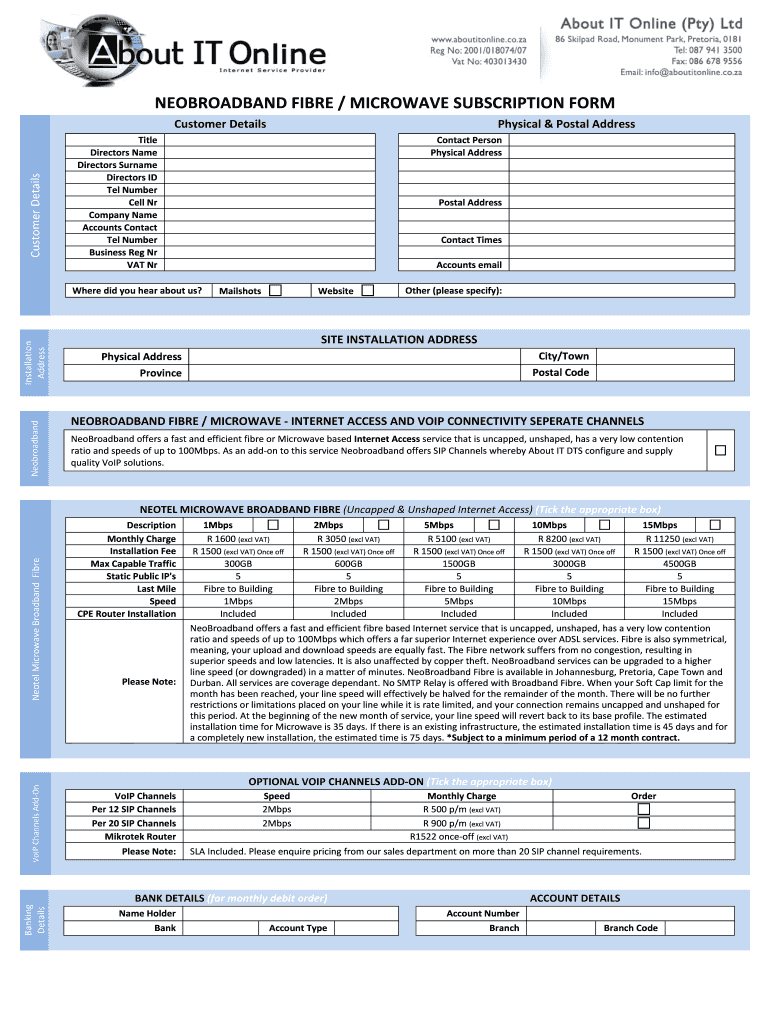 NEOBROADBANDFIBRE/MICROWAVESUBSCRIPTIONFORM CustomerDetails Title Directorate DirectorsSurname Directors ID Renumber Cellar CompanyName AccountsContact Renumber Businessmen Later ContactPerson PhysicalAddress