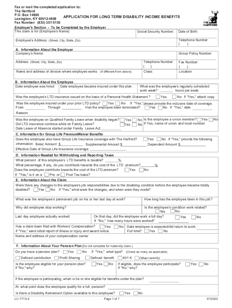 Fax or mail the completed application to: Clear Form The Hartford P.O. Box 14869 APPLICATION FOR LONG TERM DISABILITY INCOME BENEFITS Lexington, KY 405124869 Fax Number: (833) 3575153 Employer\'s