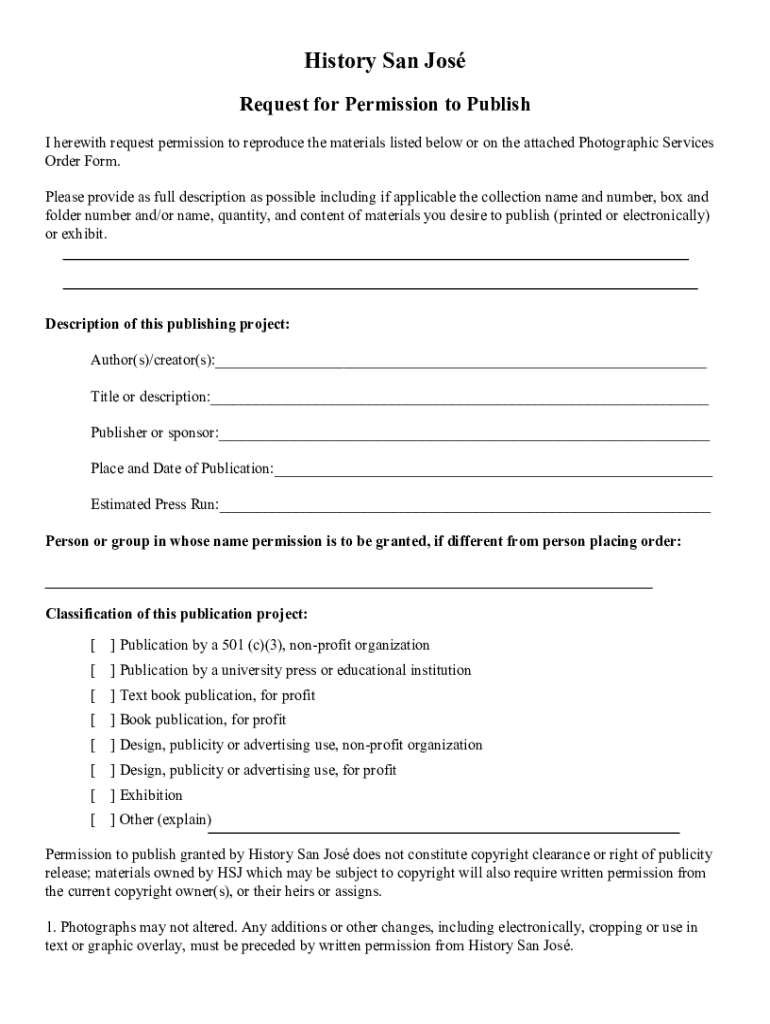 History San Jo's Request for Permission to Publish I herewith request permission to reproduce the materials listed below or on the attached Photographic Services Order Form. Please provide as full