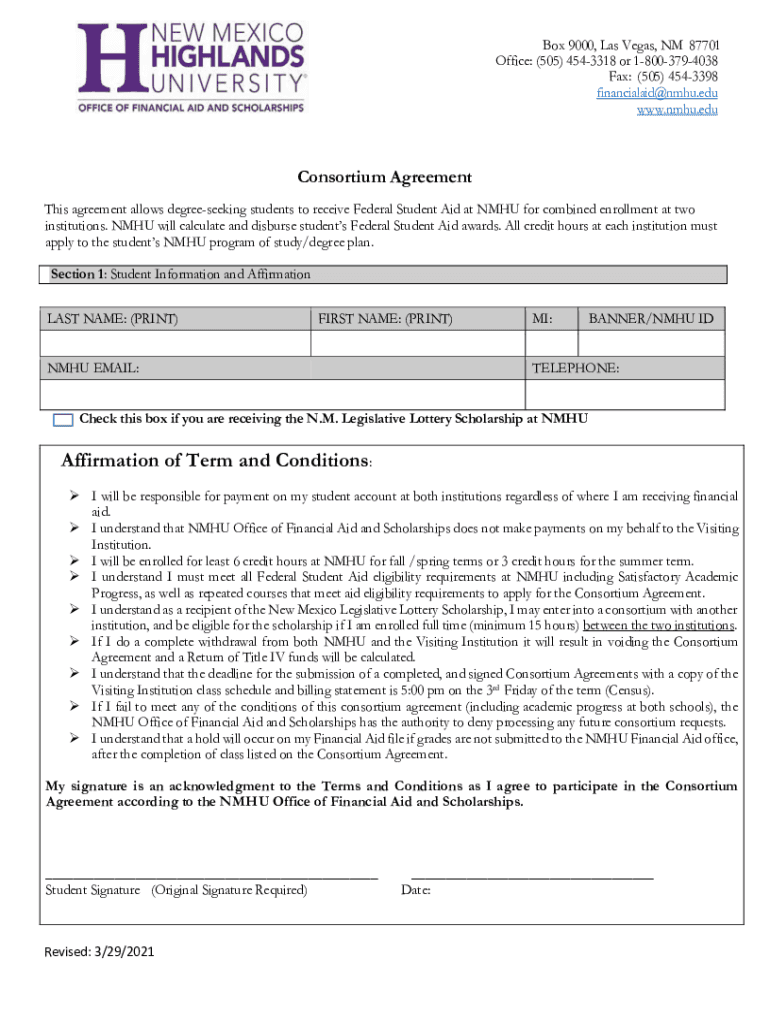 Box 9000, Las Vegas, NM 87701 Office: (505) 4543318 or 18003794038 Fax: (505) 4543398 financial aid×NHS.edu www.nmhu.eduConsortium Agreement This agreement allows degree seeking students to receive