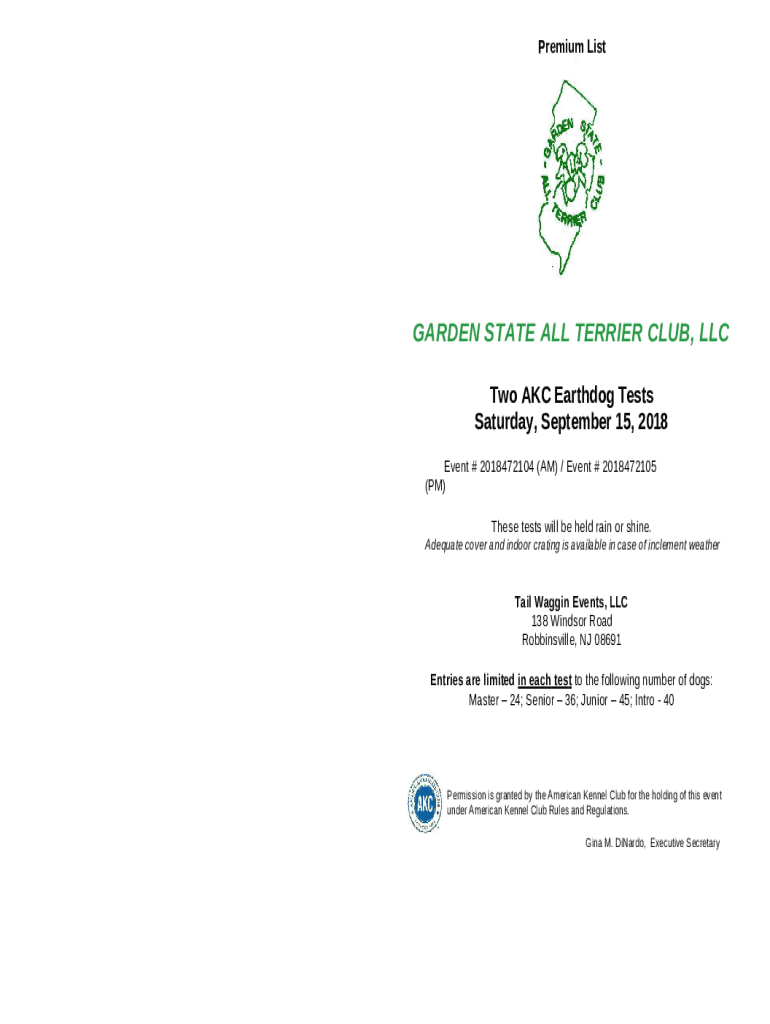The www.apps.akc.orgappsclubsearchAmerican Kennel Club - Garden State All Terrier Club, Inc ... is a Word document required to be submitted to the specific address to provide some info. It needs to be completed and signed, which may be done in hard copy, or using a certain software like PDFfiller. It helps to fill out any PDF or Word document right in the web, customize it depending on your purposes and put a legally-binding electronic signature. Right away after completion, you can easily send the www.apps.akc.orgappsclubsearchAmerican Kennel Club - Garden State All Terrier Club, Inc ... to the relevant receiver, or multiple ones via email or fax. The blank is printable as well because of PDFfiller feature and options proposed for printing out adjustment. Both in digital and physical appearance, your form should have a neat and professional appearance. It's also possible to save it as the template for further use, so you don't need to create a new file over and over. Just edit the ready form.