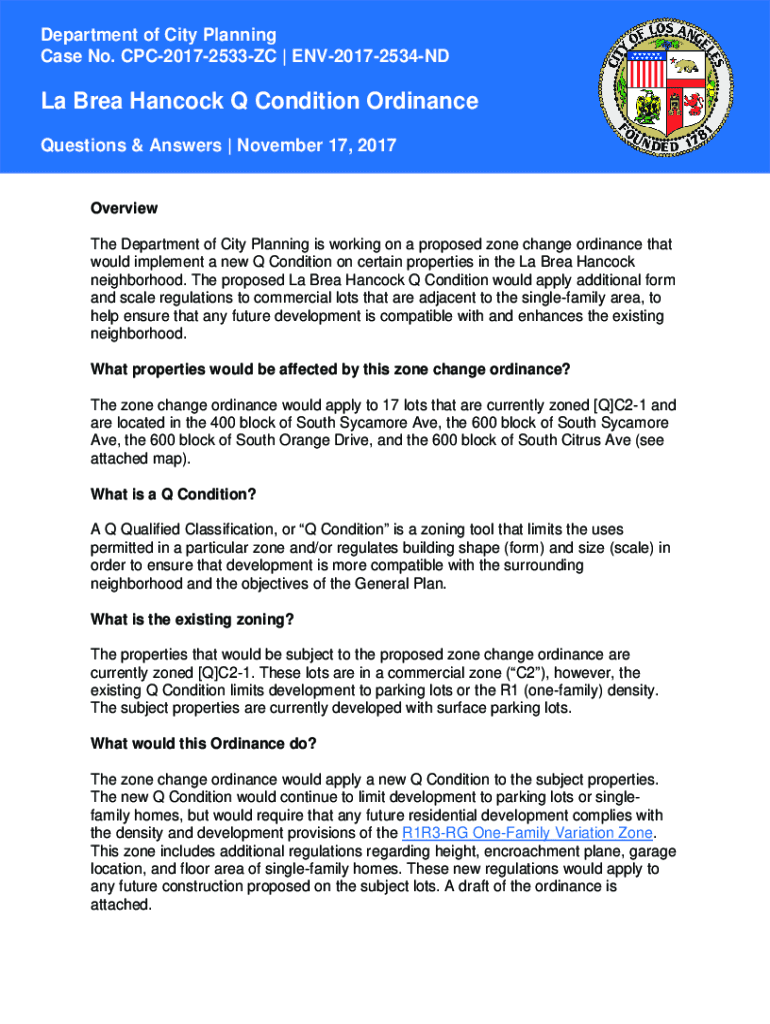 Department of City Planning Case No. CPC20172533ZC | ENV20172534NDLa Area Hancock Q Condition Ordinance Questions & Answers | November 17, 2017Overview The Department of City Planning is working on