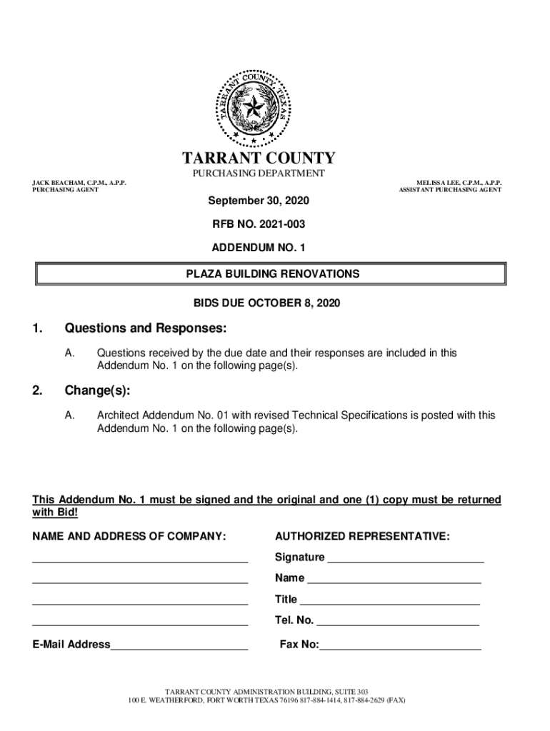 TARRANT COUNTY PURCHASING DEPARTMENT JACK BEA CHAM, C.P.M., A.P.P. PURCHASING AGENTMELISSA LEE, C.P.M., A.P.P. ASSISTANT PURCHASING AGENT September 30, 2020, ROB NO. 2021003 ADDENDUM NO. 1 PLAZA BUILDING