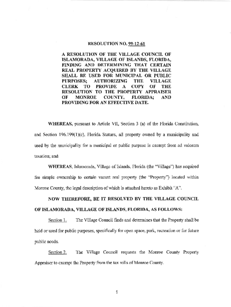 RESOLUTION NO. 991261 A RESOLUTION OF THE VILLAGE COUNCIL OF ISLAMABAD, VILLAGE OF ISLANDS, FLORIDA, FINDING AND DETERMINING THAT CERTAIN REAL PROPERTY ACQUIRED BY THE VILLAGE SHALL BE USED FOR MUNICIPAL