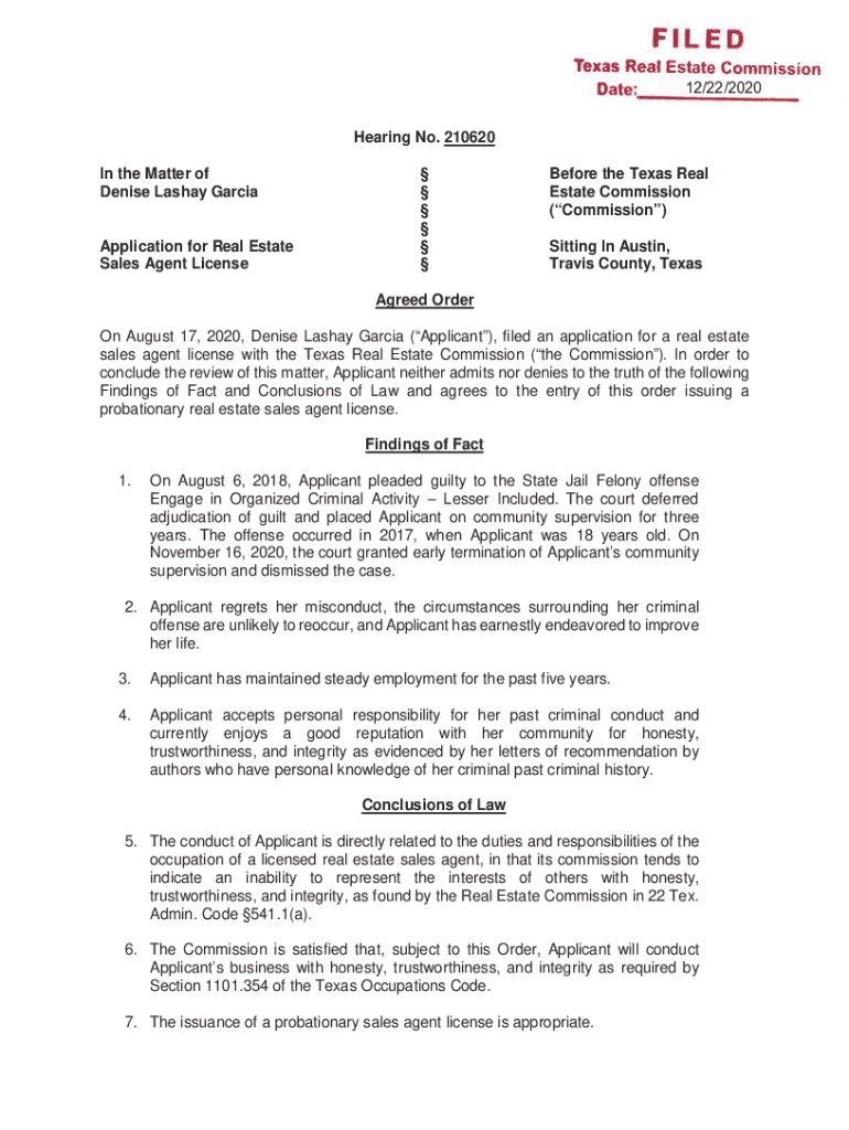 12/22/2020 Hearing No. 210620 In the Matter of Denise Sashay GarciaApplication for Real Estate Sales Agent License Before the Texas Real Estate Commission (Commission) Sitting In Austin, Travis County,