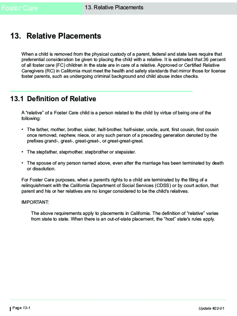 Foster Care MediCal13. Relative Placements13. Relative Placements When a child is removed from the physical custody of a parent, federal and state laws require that preferential consideration be given