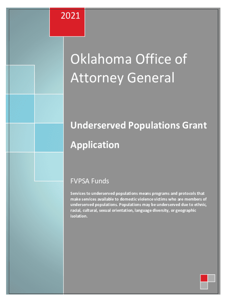 2021Oklahoma Office of Attorney General Underserved Populations Grant ApplicationFVPSA Funds Services to underserved populations means programs and protocols that make services available to domestic