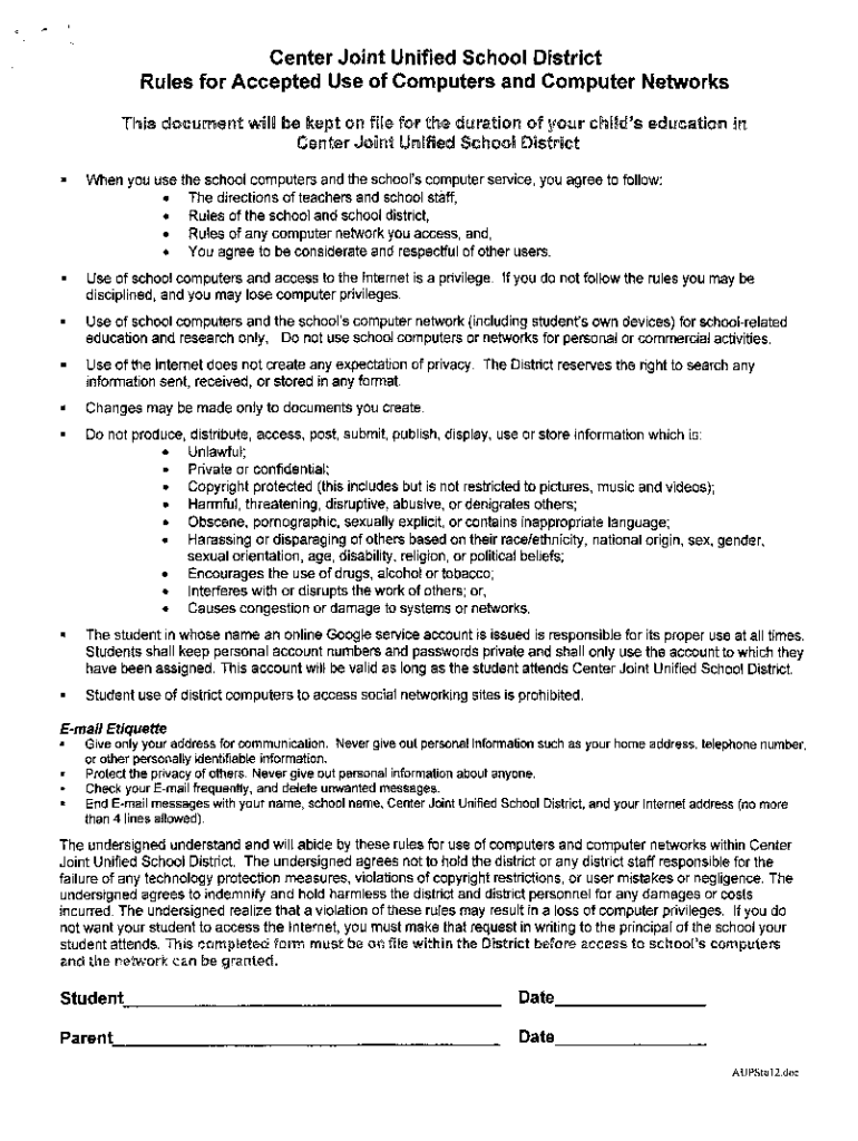 Center Joint Unified School DistrictRules for Accepted Use of Computers and Computer Networks This document WWII be kept on file for the duration of your child\'s education In Center Joint Unified