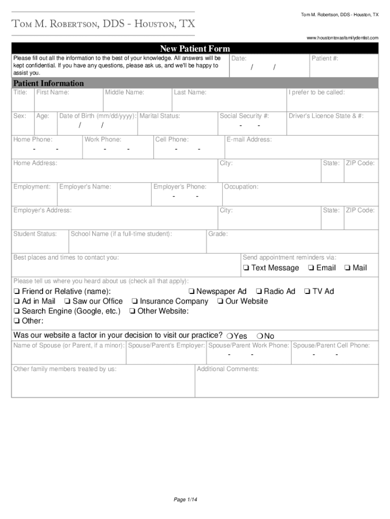 Get the free Tom M. Robertson, DDS - Houston, TX New Patient Forms. Tom M. Robertson, DDS - Houst...
