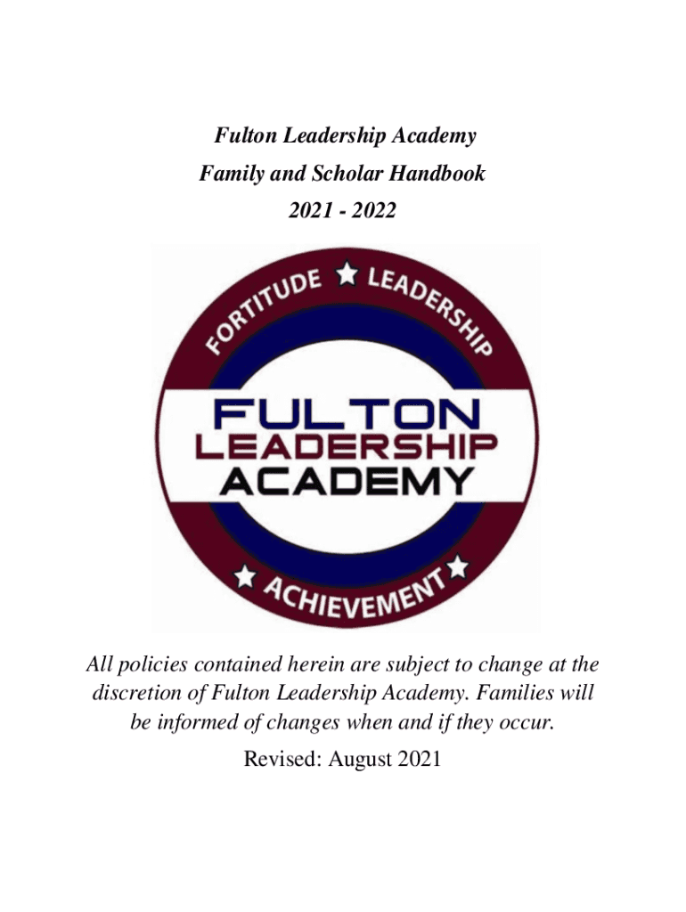 Fulton Leadership Academy Family and Scholar Handbook 2021 2022All policies contained herein are subject to change at the discretion of Fulton Leadership Academy. Families will be informed of changes