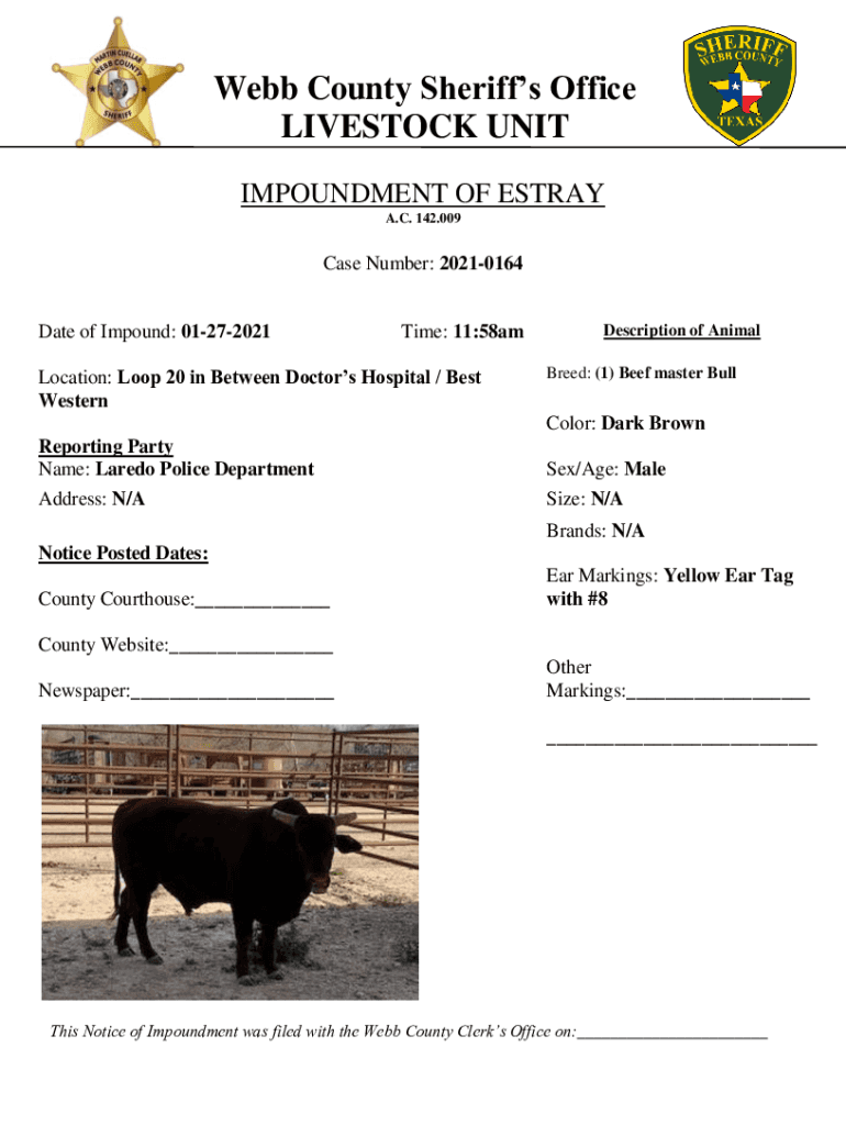 Webb County Sheriffs Office LIVESTOCK UNIT IMPOUNDMENT OF STRAY A.C. 142.009Case Number: 20210164Date of Impound: 01272021Time: 11:58amLocation: Loop 20 in Between Doctors Hospital / Best WesternDescription