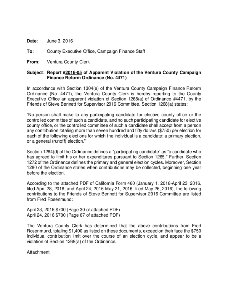 Date:June 3, 2016To:County Executive Office, Campaign Finance Stafford:Ventura County ClerkSubject: Report #201605 of Apparent Violation of the Ventura County Campaign Finance Reform Ordinance (No.