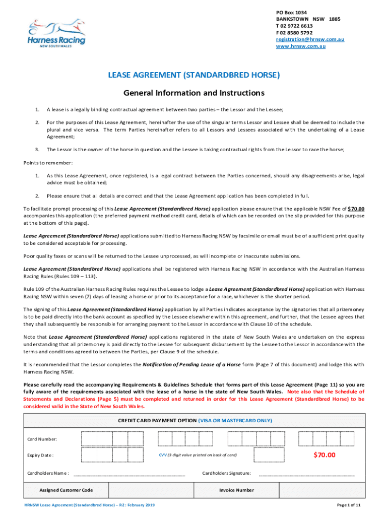 PO Box 1034 BANKSTOWN NSW 1885 T 02 9722 6613 F 02 8580 5792 registration×hrnsw.com.AU www.hrnsw.com.auLEASE AGREEMENT (STANDARDIZED HORSE) General Information and Instructions 1. A lease is a legally