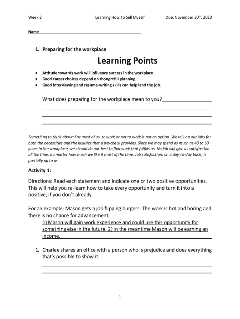Week 2Learning How To Sell Myself: November 30th, 2020Name1. Preparing for the workplace Attitude towards work will influence success in the workplace. Good career choices depend on thoughtful planning.