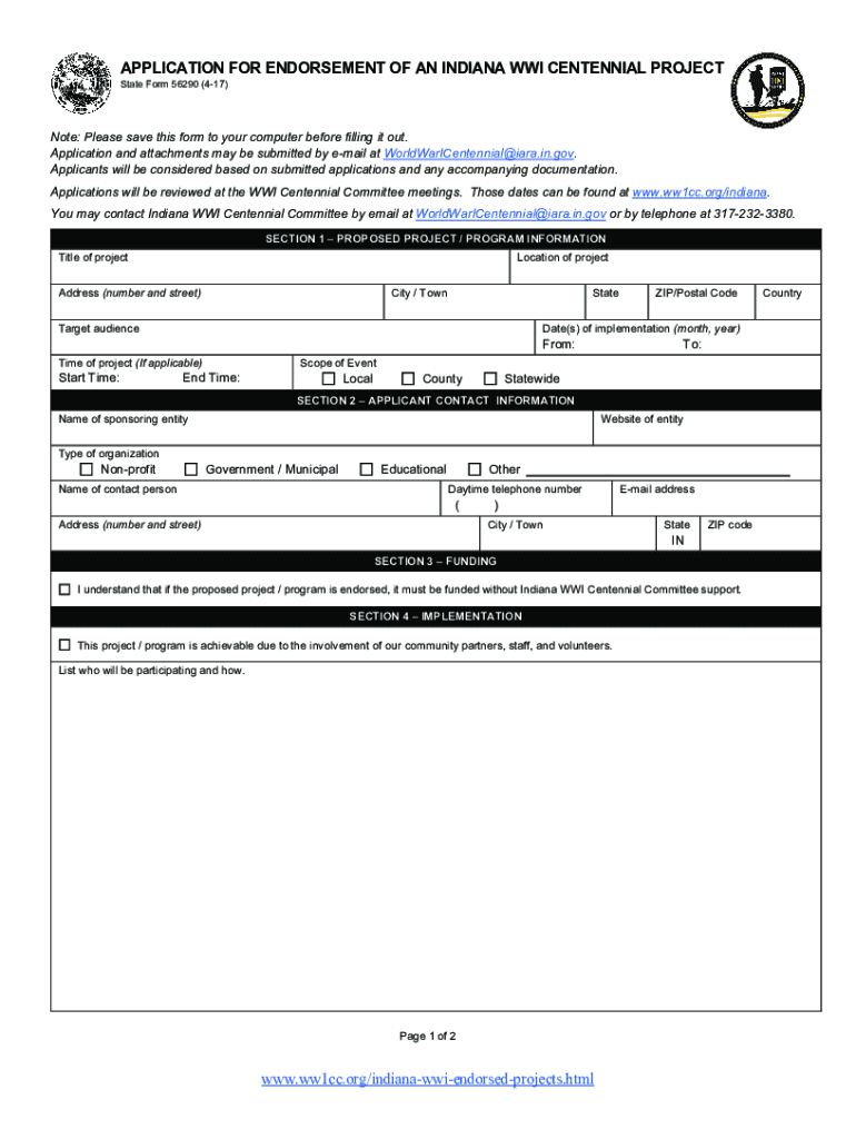 Indiana World War I Centennial Committee 402 W. Washington Street, Room W472 Indianapolis, IN 46204 WorldWarICentennial×IRA.in.gov 3172323380 APPLICATION FOR ENDORSEMENT OF AN INDIANA WORLD WAR I