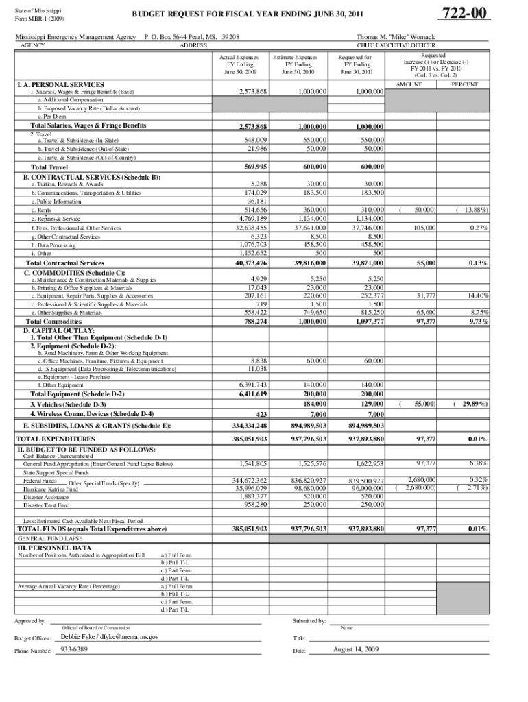 State of Mississippi Form MBR1 (2009)72200BUDGET REQUEST FOR FISCAL YEAR ENDING JUNE 30, 2011Mississippi Emergency Management Agency. O. Box 5644 Pearl, MS. 39208AGENCYThomas M. \” Mike\” WomackADDRESSCHIEF