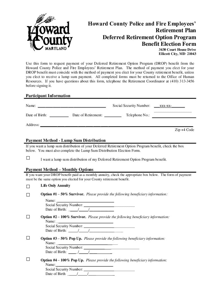 Howard County Police and Fire Employees Retirement Plan Deferred Retirement Option Program Benefit Election Form 3430 Court House Drive Ellicott City, MD 21043Use this form to request payment of your