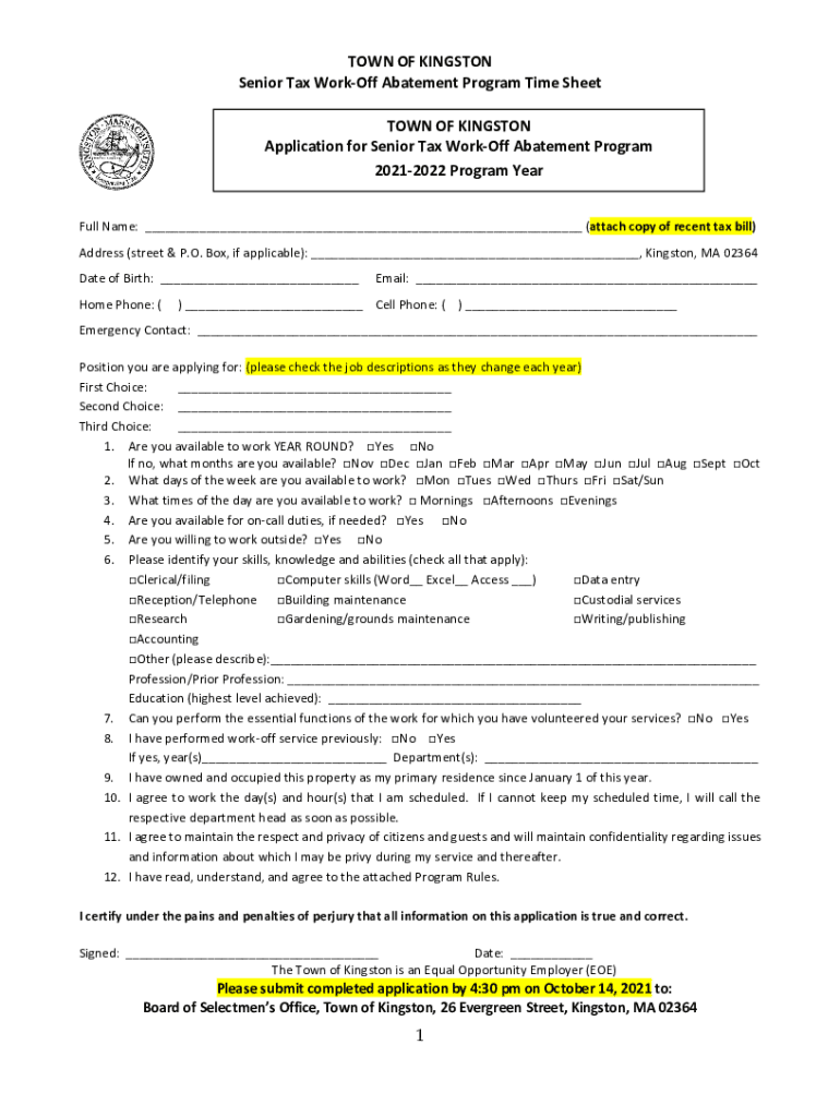 Get the free TOWN OF KINGSTON Senior Tax Work-Off Abatement Program ...