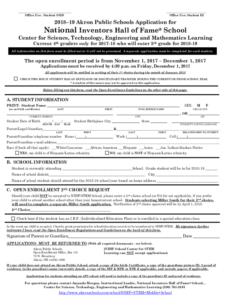 ______Office Use: Student SSIDOffice Use: Student ID201819 Akron Public Schools Application foundational Inventors Hall of Fame School Center for Science, Technology, Engineering and Mathematics Learning