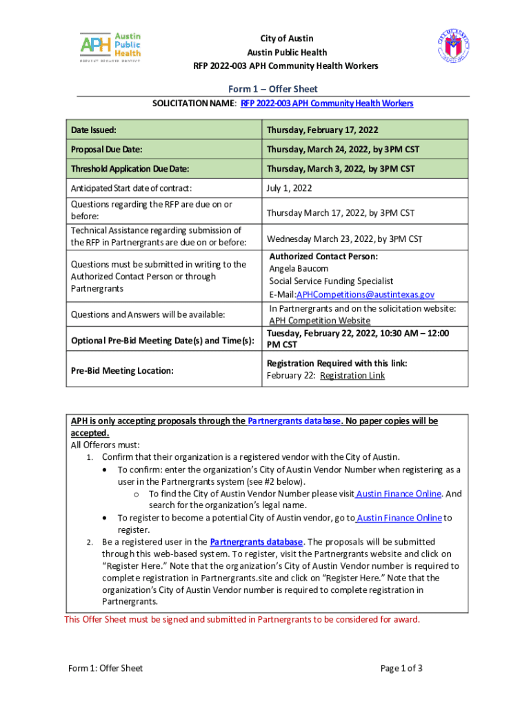 City of Austin Public Health RFP 2022003 APH Community Health WorkersForm 1 Offer SheetSOLICITATION NAME: RFP 2022003 APH Community Health Workers Date Issued:Thursday, February 17, 2022Proposal Due