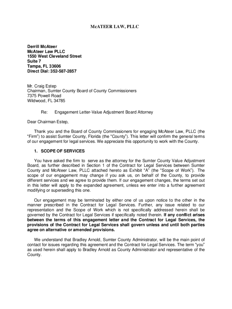 McAtee LAW, LLC DIreDerrill McAtee Law LLC 1550 West Cleveland Street Suite 7 Tampa, FL 33606 Direct Dial: 3525872857Mr. Craig Step Chairman, Sumter County Board of County Commissioners 7375 Powell