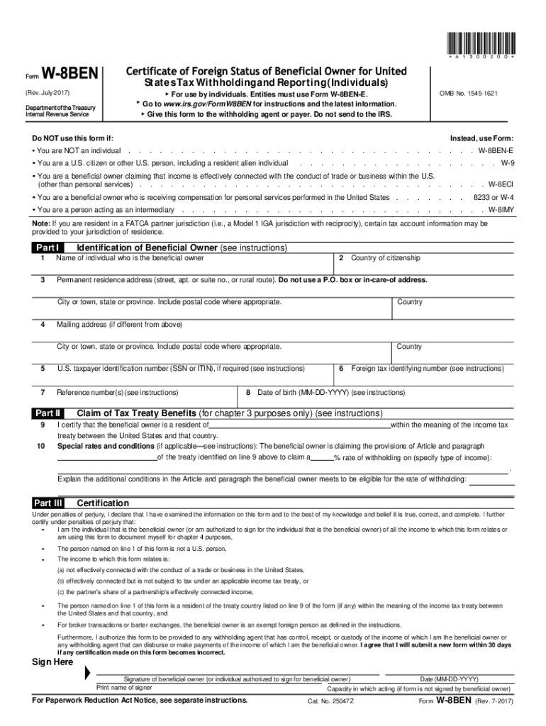 *a1300200×States Tax Withholding and Reporting (Individuals) (Rev. July 2017) For use by individuals. Entities must use Form W8BENE. Go to www.irs.gov/FormW8BEN for instructions and the latest information.