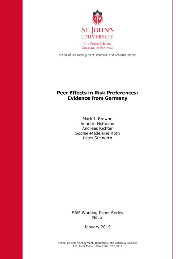 1Peer Effects in Risk Preferences: Evidence from Germany Mark J. Browne Annette Hoffmann Andreas Richter Sophie Madeleine Roth Petra SteinorthSRM Working Paper Series No. 2 January 2019School of Risk