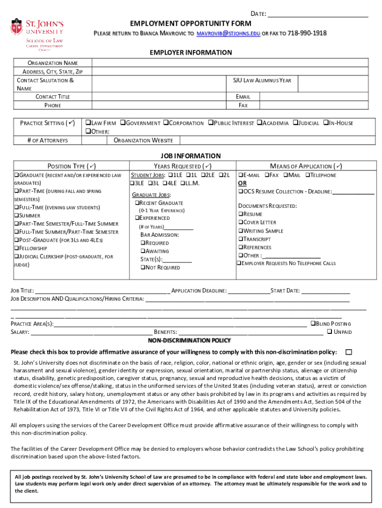 DATE: ___EMPLOYMENT OPPORTUNITY FORMULAS RETURN TO BIANCA MARKOVIC TO MARVIN×JOHNS.EDU OR FAX TO 7189901918EMPLOYER INFORMATION ORGANIZATION NAME ADDRESS, CITY, STATE, ZIP CONTACT SALUTATION & NAME