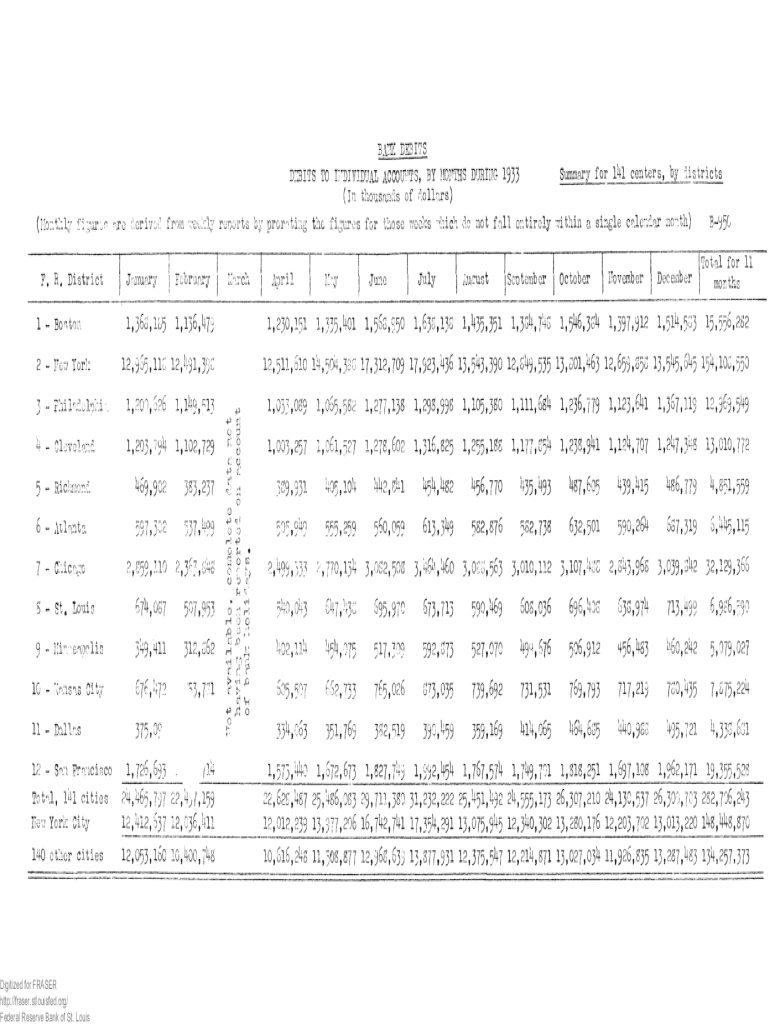 BACK DEBITS DIGITS TO INDIVIDUAL ACCOUNTS, BY MONTHS DURING 1933 (in thousands of d Ella rs)Summary for OHL centers, by d is t r IC t s(Monthly phi×urn .JRE derived from weekly reports by p Rosa