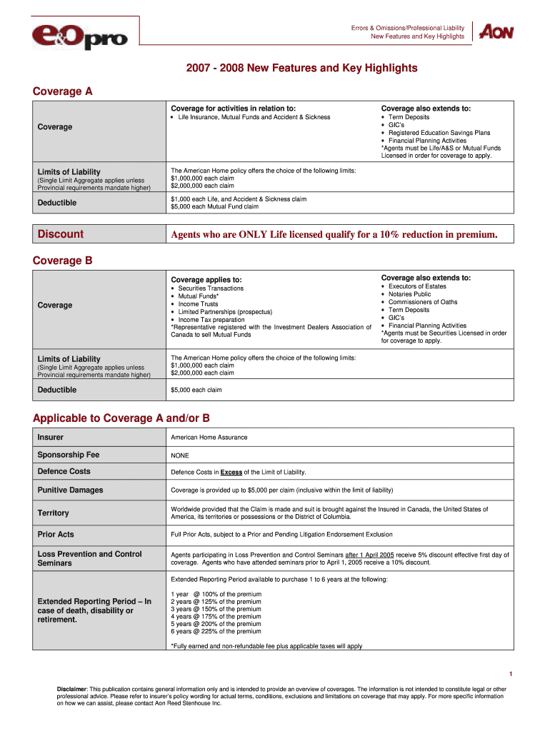 Errors & Omissions/Professional Liability New Features and Key Highlights 2007 2008 New Features and Key Highlights Coverage A Coverage for activities in relation to: Coverage also extends to: Life