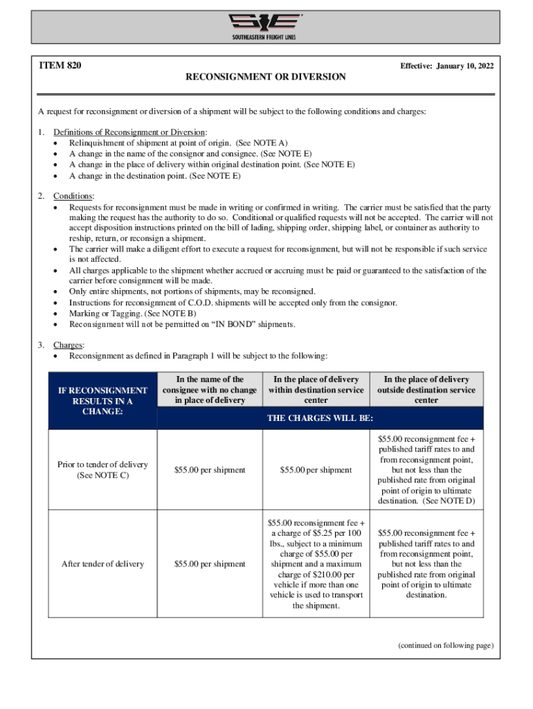 ITEM 820Effective: January 10, 2022RECONSIGNMENT OR DIVERSION request for reconsignment or diversion of a shipment will be subject to the following conditions and charges: 1. Definitions of Reconsignment