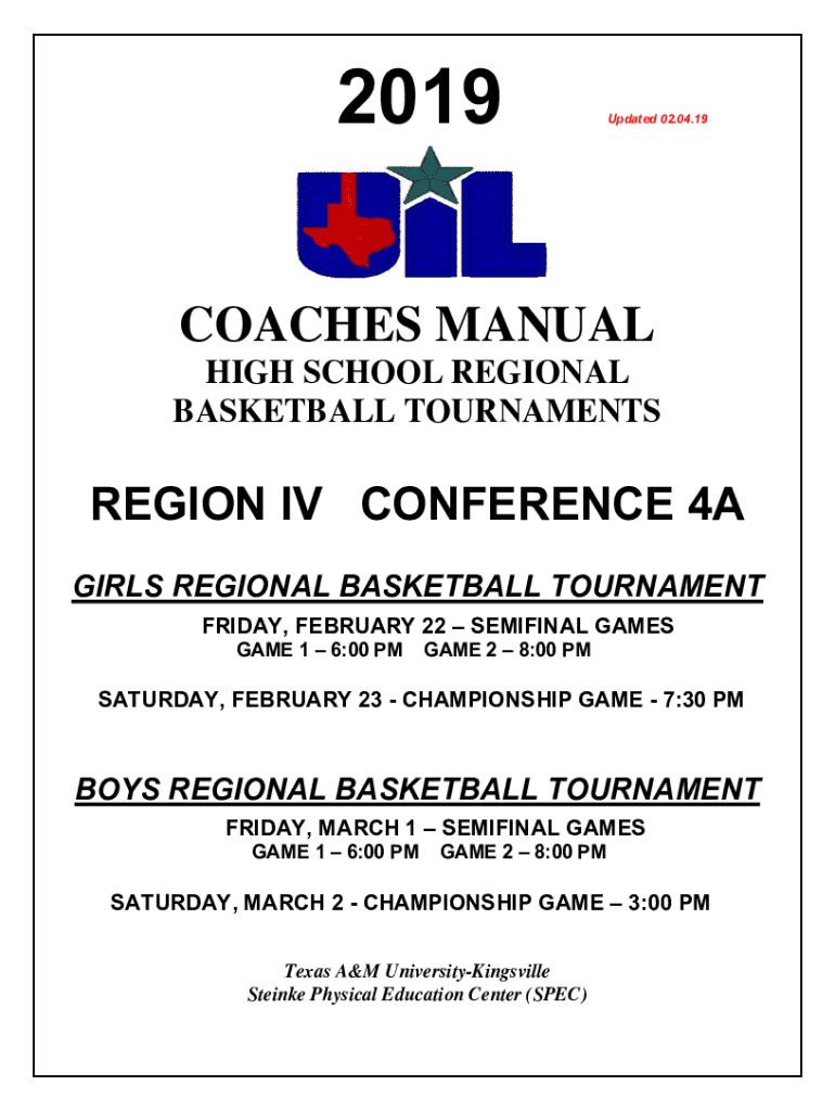 2019Updated 02.04.19COACHES MANUAL HIGH SCHOOL REGIONAL BASKETBALL TOURNAMENTSREGION IV CONFERENCE 4A GIRLS REGIONAL BASKETBALL TOURNAMENT FRIDAY, FEBRUARY 22 SEMIFINAL GAMES GAME 1 6:00 PMG AME 2