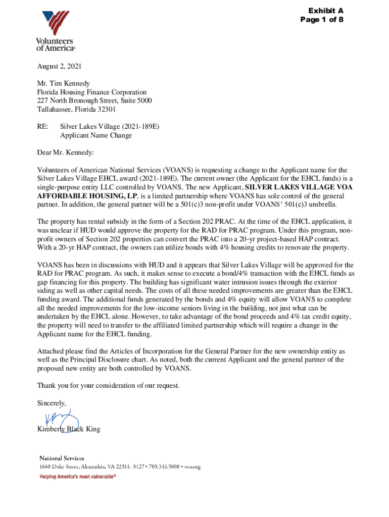 Exhibit A Page 1 of 8August 2, 2021 Mr. Tim Kennedy Florida Housing Finance Corporation 227 North Borough Street, Suite 5000 Tallahassee, Florida 32301 RE:Silver Lakes Village (2021189E) Applicant