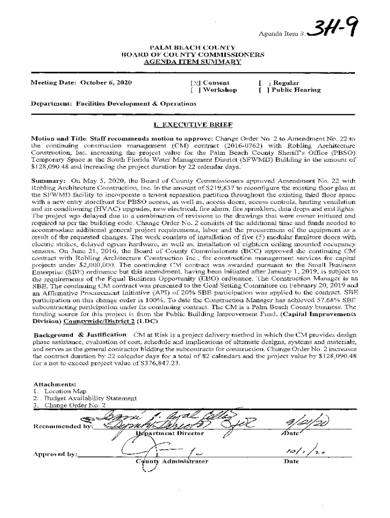 Agenda item#:3H? PALM BEACH COUNTY BOARD OF COUNTY COMMISSIONERS AGENDA ITEM SUMMARYMeeting Date: October 6, 2020×X) Consent [ ] Workshop[\'j Regular[ ] Public HearingDepartment: Facilities Development