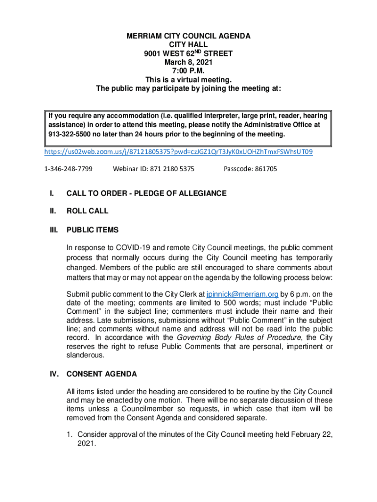 MERRIAM CITY COUNCIL AGENDA CITY HALL 9001 WEST 62ND STREET March 8, 2021 7:00 P.M. This is a virtual meeting. The public may participate by joining the meeting at:If you require any accommodation