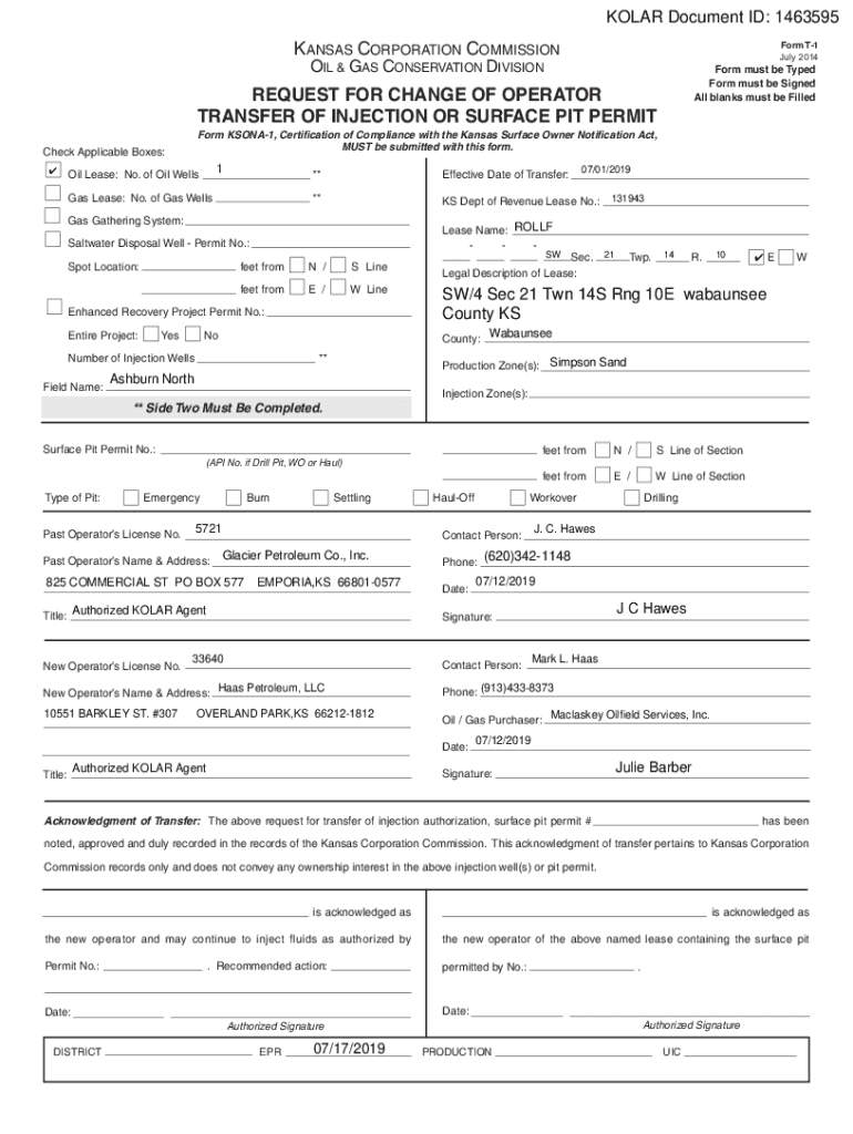 SOLAR Document ID: 1463595KANSAS CORPORATION Commissioner T1 July 2014OIL & GAS CONSERVATION DIVISIONForm must be Typed Form must be Signed All blanks must be FilledREQUEST FOR CHANGE OF OPERATOR