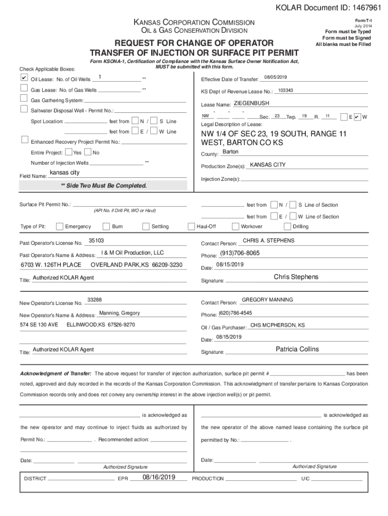 SOLAR Document ID: 1467961KANSAS CORPORATION Commissioner T1 July 2014OIL & GAS CONSERVATION DIVISIONForm must be Typed Form must be Signed All blanks must be FilledREQUEST FOR CHANGE OF OPERATOR