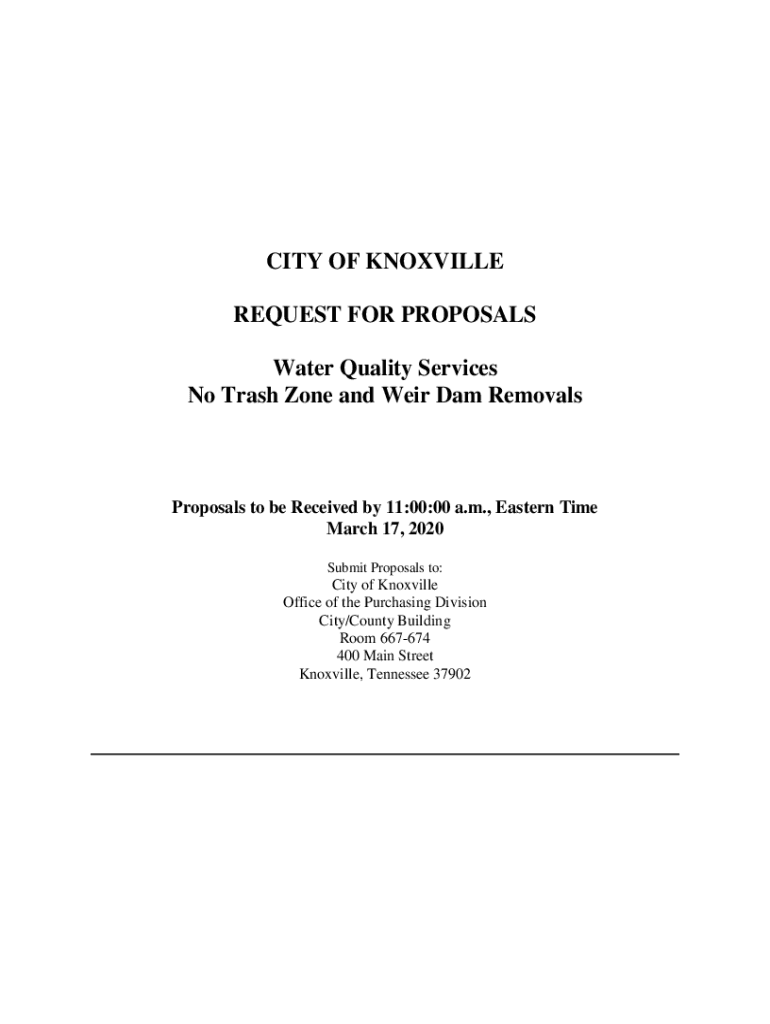 CITY OF KNOXVILLE REQUEST FOR PROPOSALS Water Quality Services No Trash Zone and Weir Dam RemovalsProposals to be Received by 11:00:00 a.m., Eastern Time March 17, 2020, Submit Proposals to:City of