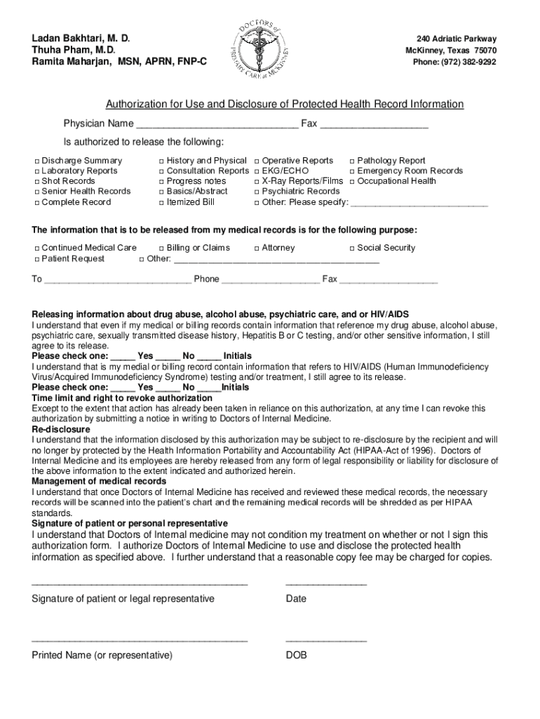 Laden Akhtar, M. D. Thu ha Ham, M.D. Amiga Saharan, MSN, APRN, FNPC240 Adriatic Parkway McKinney, Texas 75070 Phone: (972) 3829292Authorization for Use and Disclosure of Protected Health Record Information