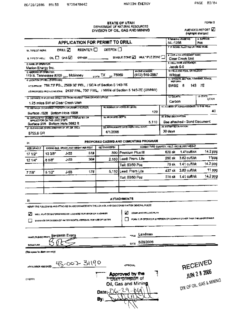 62/64PAGEMARION ENERGY972547044209:5806/28/2006FORM3STATE OF UTAH DEPARTMENT NATURALRESOURCESAMENDED REPORTDIVISIONOF OIL, GAS AND MININGAPPLICATIONFOR PERMIT Drilling. rrreGASOILCF wet.CMULT1PLE