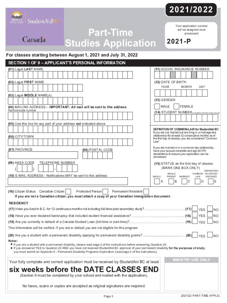 2021/2022PartTime Studies Application PART TIME STUDIES FINANCIAL ASSISTANCE 1. 2. 3. 4. 5. 6. Canada Student Grant for Students with Permanent Disabilities (CSG PD) B.C. Supplemental Bursary for