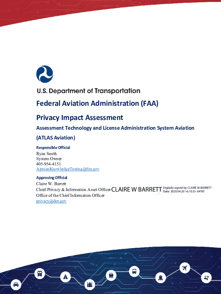 U.S. Department of Transportation FederalAviationAdministration(FAA) PrivacyImpactAssessment AssessmentTechnologyandLicenseAdministrationSystemAviation (ATLASAviation) ResponsibleOfficial Ryan Smith