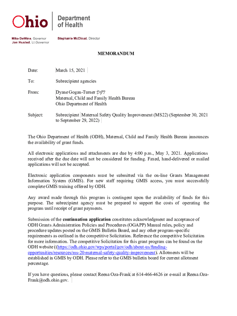 MEMORANDUM Date:March 15, 2021To:Subrecipient agenciesFrom:Diane GoganTurner DGT Maternal, Child and Family Health Bureau Ohio Department of HealthSubject:Subrecipient Maternal Safety Quality Improvement