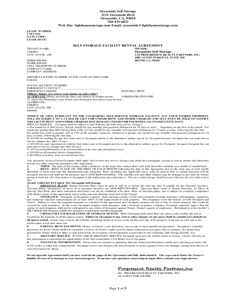 Oceanside Self Storage 2121 Oceanside Blvd Oceanside, CA, 92054 7604336822 Website: lighthousestorage.com Email: Oceanside×lighthousestorage.com LEASE NUMBER: UNIT NO: GATE CODE: LEASE DATE:SELF