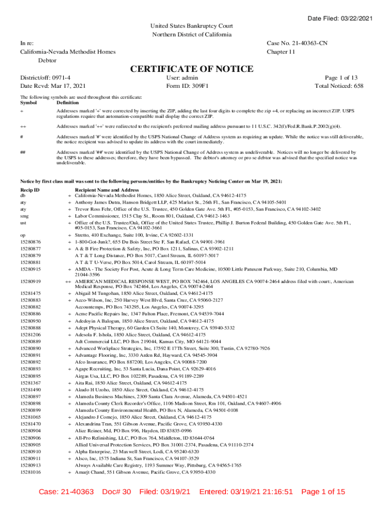 Date Filed: 03/22/2021 United States Bankruptcy Court Northern District of California In re: California Nevada Methodist Homes Debtor Case No. 2140363CN Chapter 11CERTIFICATE OF NOTICE District/off:
