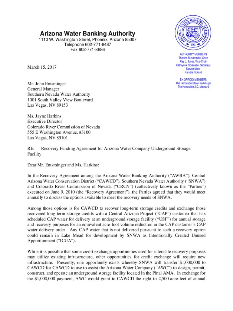 Arizona Water Banking Authority 1110 W. Washington Street, Phoenix, Arizona 85007 Telephone 6027718487 Fax 6027718686March 15, 2017Mr. John Entsminger General Manager Southern Nevada Water Authority