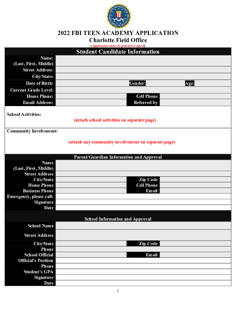 2022 FBI TEEN ACADEMY APPLICATION Charlotte Field Office (Application must be printed or typed)Name: (Last, First, Middle) Street Address: City/State: Date of Birth: Current Grade Level: Home Phone: