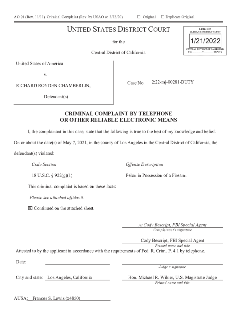 AO 91 (Rev. 11/11) Criminal Complaint (Rev. by the USA on 3/12/20) Original Duplicate OriginalUNITED STATES DISTRICT COURTIER, U.S. DISTRICT COURT for the1/21/2022LODGEDCENTRAL DISTRICT OF CALIFORNIA