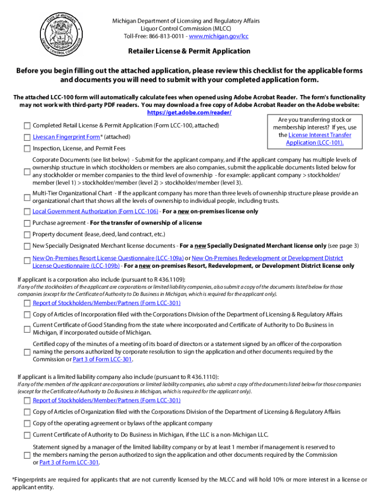 Michigan Department of Licensing and Regulatory Affairs Liquor Control Commission (LCC) Toll-free: 8668130011 www.michigan.gov/lccRetailer License & Permit Application Before you begin filling out