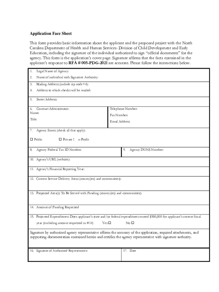 Application Face Sheet This form provides basic information about the applicant and the proposed project with the North Carolina Department of Health and Human Services Division of Child Development